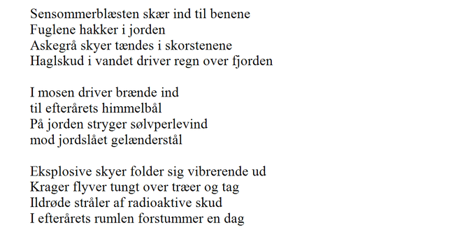 Sensommerblæsten skær ind til benene // Fuglene hakker i jorden // Askegrå skyer tændes i skorstenene // Haglskud i vandet driver regn over fjorden // // I mosen driver brænde ind // til efterårets himmelbål // På jorden stryger sølvperlevind // mod jordslået gelænderstål // // Eksplosive skyer folder sig vibrerende ud // Krager flyver tungt over træer og tag // Ildrøde stråler af radioaktive skud // I efterårets rumlen forstummer en dag //