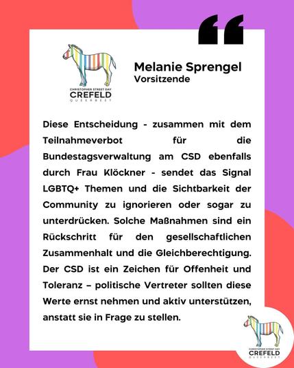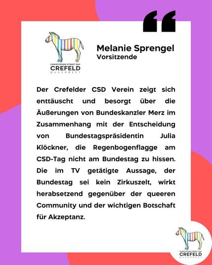 Der Crefelder CSD Verein zeigt sich enttäuscht und besorgt über die Äußerungen von Bundeskanzler Merz im Zusammenhang mit der Entscheidung von Bundestagspräsidentin Julia Klöckner, die Regenbogenflagge am CSD-Tag nicht am Bundestag zu hissen. Die im TV getätigte Aussage, der Bundestag sei kein Zirkuszelt, wirkt herabsetzend gegenüber der queeren Community und der wichtigen Botschaft für Akzeptanz und Vielfalt.