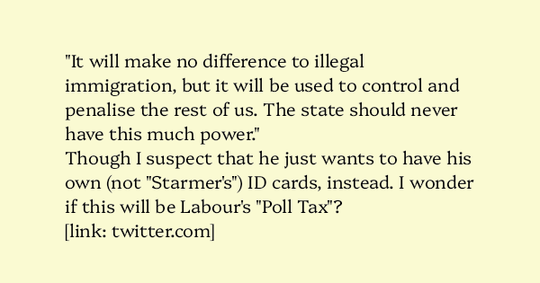 Though I suspect that he just wants to have his own (not “Starmer’s”) ID cards, instead. I wonder if this will be Labour’s “Poll Tax”?