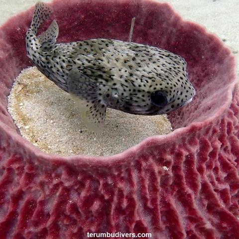 Porcupinefish is hidding in a Giant Barrel sponge