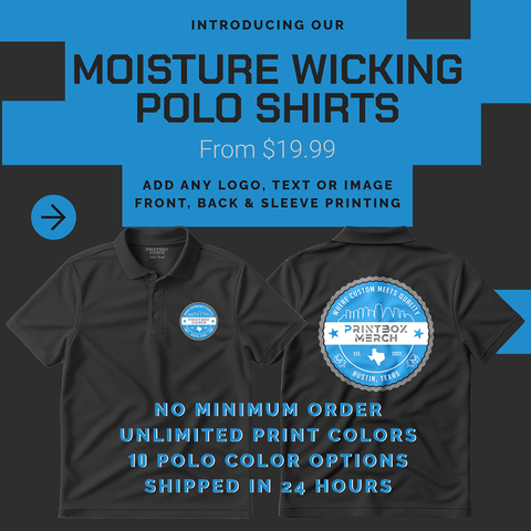 Custom Moisture Wicking Polos with any Logo or Text to the Front, Back and Sleeves.
