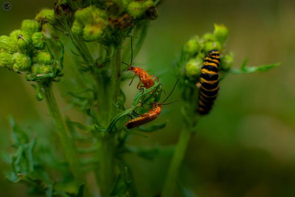 Cinnabar moth caterpillars and Red Soldier beetles on Common Ragwort plants