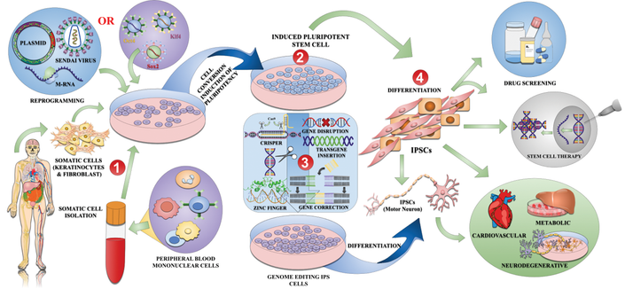 Abstract The advancement of cell reprogramming technologies has revolutionized the landscape of regenerative medicine and drug research. This review scrutinizes the process of reprogramming somatic cells into stem cells, particularly focusing on induced pluripotent stem cells (iPSCs), and elucidates their evolution over time. Initially, the review delineates the disparities between normal cells and stem cells. Subsequently, it delves into the historical trajectory of embryonic stem cells (ESCs) and iPSCs. The pivotal role of somatic cell reprogramming in pharmaceutical biotechnology is explored, highlighting its applications in disease modeling, drug discovery, regenerative medicine, and personalized therapies. The review provides insight into the fundamental principles of reprogramming techniques, encompassing iPSC generation, transcription factors, epigenetic modifications, and non-integrative reprogramming methods. Special emphasis is placed on genome-editing techniques such as CRISPR-Cas9, TALENs, ZFNs, and base editing, given their paramount importance in cellular reprogramming endeavours. Finally, the review deliberates on the diverse modalities through which cellular reprogramming can rejuvenate dead cells into stem cells, underscoring the transformative potential of this technology across various domains of biomedicine. By elucidating the multifaceted effects and opportunities of somatic cell reprogramming, this review aims to serve as a valuable resource for scholars and practitioners in the realms of cellular and molecular biology. Graphical Abstract