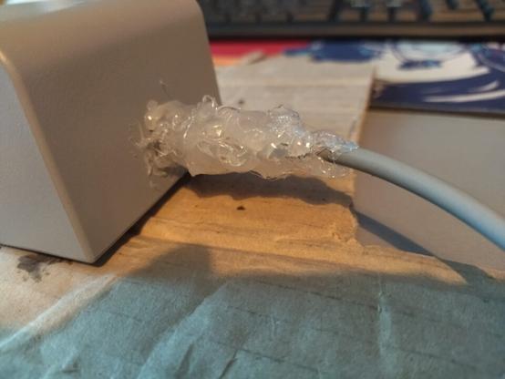 Girando un pochino ‘sto blocco di merda, alla fine ha funzionato, però a questo punto è chiaro che in questo stato le cose non potessero che peggiorare. Quindi, considerato che sono tirchia, che comunque questo alimentatore ufficiale Nintendo non si vende (almeno, non più), che eviterei a prescindere alimentatori cinesi, e che non so saldare (non che in questo caso si possa fare, si è rotto a merda e il cavo in sé è comunque strambo)… Per questa riparazione hardware ho preso, da brava sviluppatrice software, la colla a caldo e, a costo della suddetta crisalide ed una decina di minuti spesi per costruirla bene, ora l’alimentatore sembra fungere alla più completa perfezione, senza smettere di erogare energia al minimo giramento come prima. 😳🎊