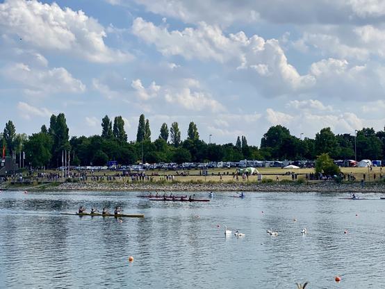 I sat down on bench and ate some Streuselkuchen and filled up my water bottles at a fountaine. Then I started my way back via Thayngen, which took me mostly through the busy city of Schaffhausen and then following along a road with heavy traffic. Luckily the cycling path veered off the road and followed the Biber creek with fields planted with corn on the left and the creek to the right. I passed through the german enclave Buch, which is completely enveloped by Switzerland and from there mostly took back road through fields and meadows with the occasional gravel road towards Radolfzell. There is this lovely bicycle road between the rail roads and the lake shore shaded by trees, which put me on the home stretch.