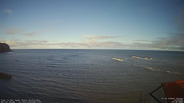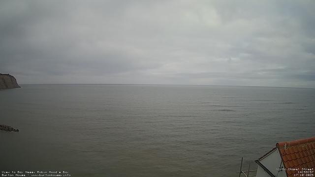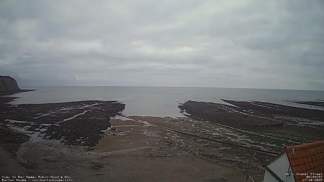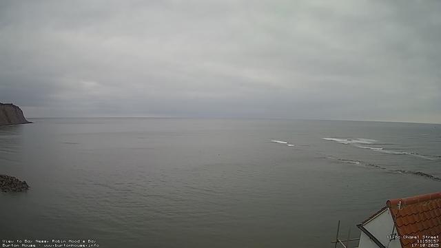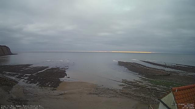 18:00 - Friday, 17-Oct. 11.7°C. The tide is currently falling with a low tide of 2.2m due at 20:46. A grey and overcast day over the sea, the calm water gently washing over the rocks on the shore. #robinhoodsbay #seascape #yorkshirecoast #northyorkshire