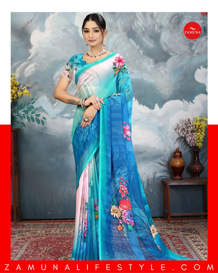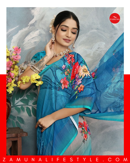 Experience the charm of ZAMUNA’s Blue Georgette Floral Saree, where timeless tradition meets modern sophistication. ✨