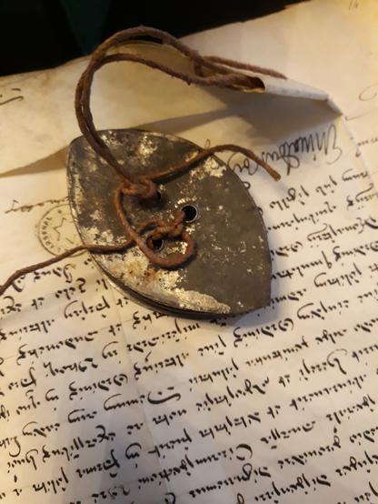 ℹLes sceaux sont des empreintes en #cire reliées à des documents, ils portent le négatif d'une empreinte qu'on appelle une matrice. Ils permettent d'identifier celui ou celle qui le possède, qu'on appelle le "#sigillant". Finalement, les sceaux jouent le rôle d'une #signature, ils authentifient des actes et garantissent l'authenticité des documents. Ils sont utilisés durant tout le Moyen Âge.