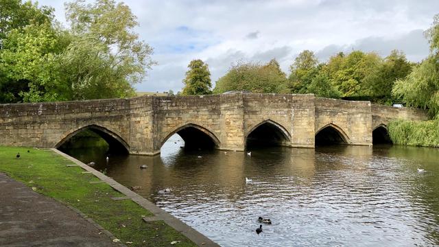 A historic stone bridge spans the River Wye in Bakewell, surrounded by the scenic greenery of the Peak District. Its multiple arches and weathered masonry highlight the areaβs rich heritage and classic historic architecture. Ducks and gulls drift along the calm water, adding to the peaceful atmosphere of this popular riverside spot. The location is a favorite for visitors enjoying the #StoneBridge views, #RiverWye charm, and #ScenicView walks through the #PeakDistrict.