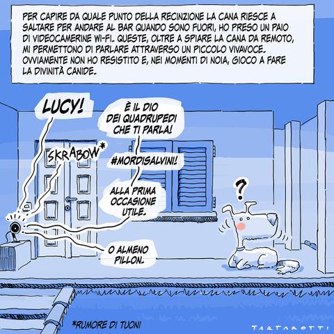 > 5 anni fa la Cana scoprì che, quando sono fuori casa, può farsi prendere dal panico, saltare la recinzione e venire a cercarmi. Così presi due minivideocamere wifi per capire dove saltasse e tenerla d'occhio. Posso anche parlarle mentre sono fuori casa. #cana #cane #scherzi