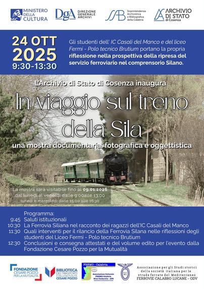 Dalle ore 9:30 alle 13:30 del 24 ottobre 2025, presso la Sala Convegni dell’Archivio di Stato di Cosenza, si terrà l’inaugurazione della mostra “In viaggio sul treno della Sila” e l’evento conclusivo del progetto didattico promosso dalla Fondazione Cesare Pozzo per la Mutualità, realizzato in collaborazione con le scuole del territorio.