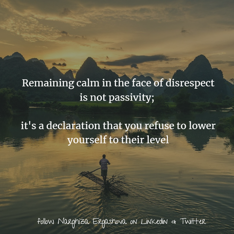 'Opting to stay composed when faced with disrespect is a potent method to uphold your dignity and self-value. It signifies that you refuse to descend to their level but instead affirm your own principles with grace. #SelfValue #Grace with Narghiza Ergashova'
