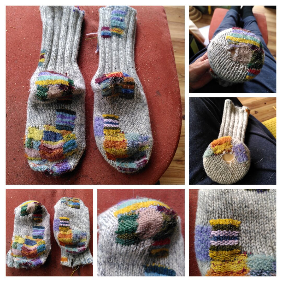 Some more holes darned on the old socks, no toes poking out anymore. I reached the 'mend-on-mend' phase with these housesocks... ๐ชก