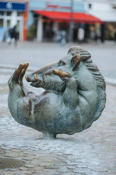 Das erste Schwein suhlt sich immer noch in Rostock im ‚Brunnen der Lebensfreude‘ und erfreut die Kinder und Erwachsene.