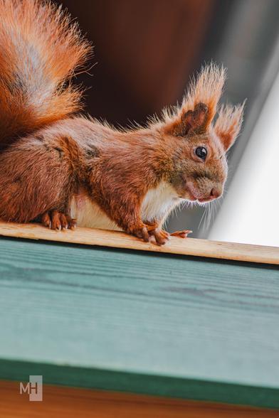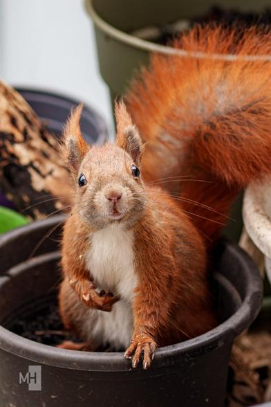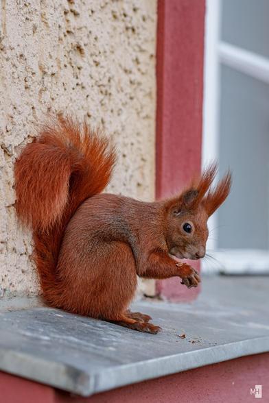 Er hat gerade Walnüsse von uns auf den höher gelegenen Balkonen anderer Aufgänge verstaut. Sowas von Balkonhörnchen! 🐿️😍