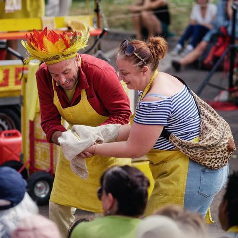 I love that this street entertainer is wearing such bright and distinctive clothes but I wish his knives were brightly coloured. Still, the reaction of (some) people was worth it even if the background is too busy to see the knives properly.
