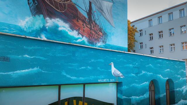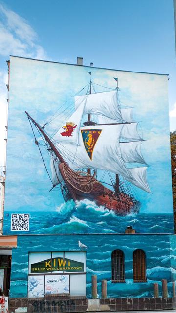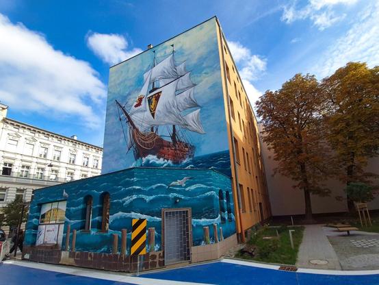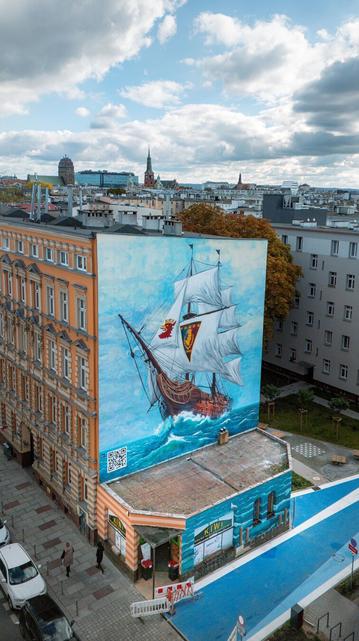 Jeden z czterech murali poświęconych klubowi piłkarskiemu Pogoń Szczecin, które w październiku pojawiły się w szczecińskiej przestrzeni miejskiej. Widoczny na zdjęciach potężny galeon, namalowany przez ekipę Wallart, można podziwiać na budynku przy ul. Bohaterów Getta 6.
