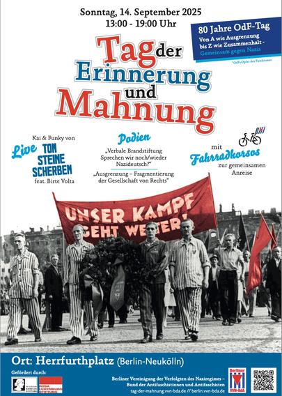 Tag der Erinnerung und Mahnung 2023 FĂŒr eine Welt des Friedens und der Freiheit â Gemeinsam gegen Krieg und Faschismus Der Tag der Erinnerung und Mahnung steht in der Tradition des Tages der Opfer des Faschismus, der zum ersten Mal am 9. September 1945 begangen wurde. Seit 1990 gehört der T