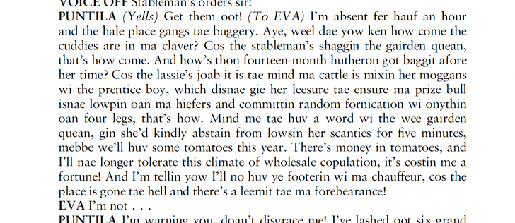 “I’ll nae longer tolerate this climate of wholesale copulation, it’s costin me a fortune! And I’m tellin yow I’ll no huv ye footerin wi ma chauffeur, cos the place is gone tae hell and there’s a leemit tae ma forebearance!”