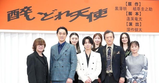 歌手・俳優の 北山宏光 が主演を務める舞台『酔いどれ天使』の製作発表が16日、都内で行われ、本作チラシのビジュアル撮影の裏話が明かされた。 この日は、闇市を支配する若いやくざである主人公・松永を演じる北山のほか、松永と対峙する酒好きで毒舌な貧乏医師・真田役の 渡辺大 、松永と同郷で彼に思いを寄せるぎん役(Wキャスト)の 横山由依 と 岡田結実 、松永の恋人でダンサーの奈々江役の 阪口珠美 、真田の診療所に住み込む美代役の 佐藤仁美 、松永の兄貴分・岡田役の 大鶴義丹 が出席した。