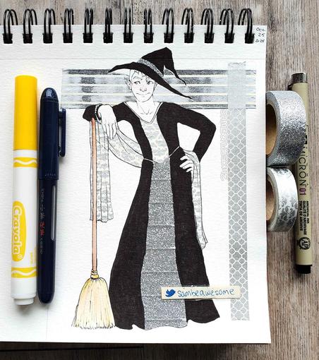 Nonbinary witch living their fashionable best life. ✨ "Silver" + "Broom" #washiween prompts. Bless lightboxes for helping me cut lmao