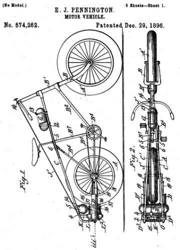 Sometimes credited with having invented the word “motorcycle”, Edward J Pennington of Cleveland, Ohio, US applied for a patent in 1893 for his ‘motor vehicle’, notable for its balloon tyres. Pennington built and demonstrated his original motorcycle design in Milwaukee in 1895. Apparently, not finding any backers for his idea he took it to England where he sold the patents for it to Harry John Lawson’s The Great Horseless Carriage Company Limited in 1896 and joined that company’s board of di...
