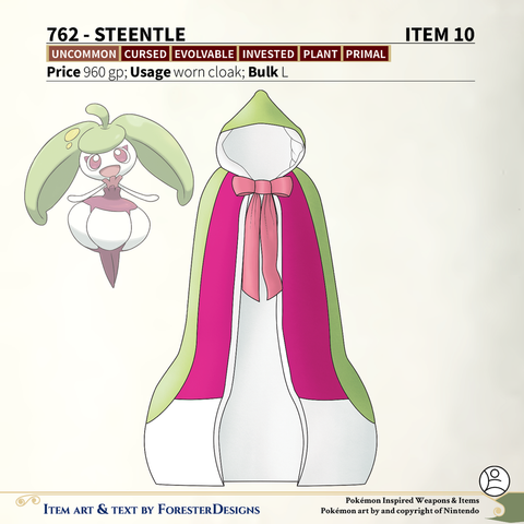A #PF2e conversion of my older #Pokemon #MagicItems, with some #Steenee & #Tsareena #cloaks to be the royalty you think you are!