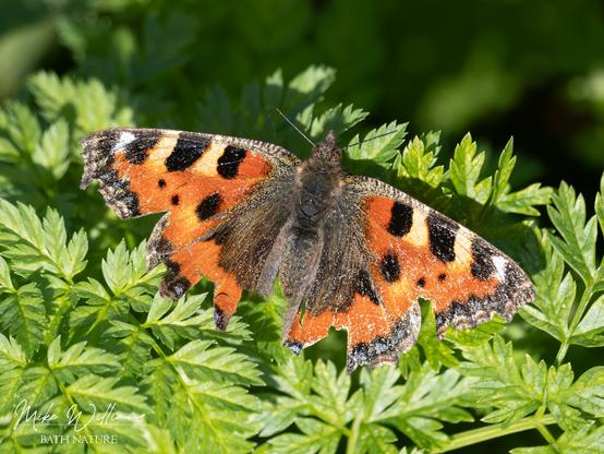 A very worn Small Tortoiseshell butterfly, seen near Stoney Littleton, near Bath.