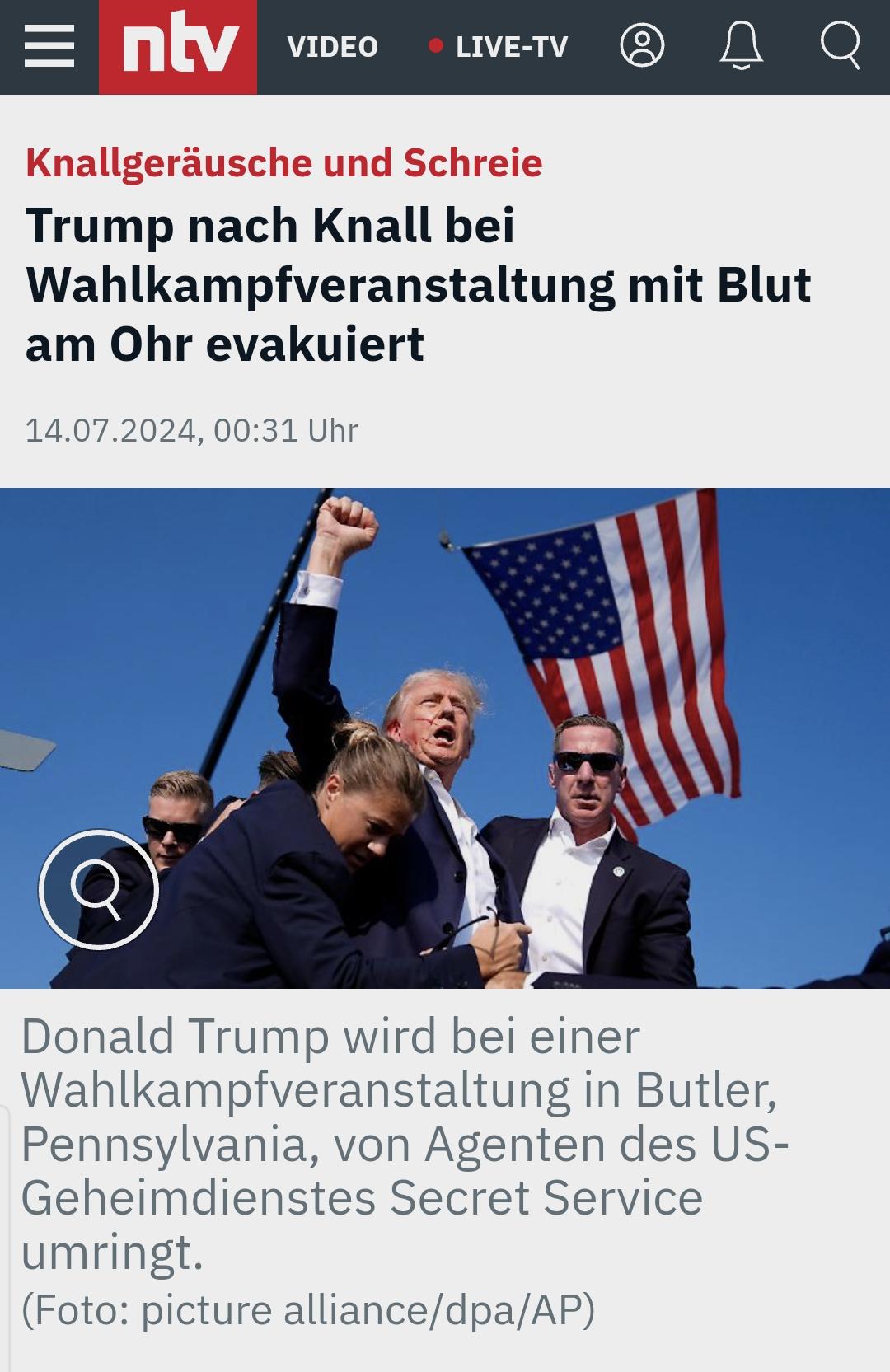 #Trump ist bei einem #Wahlkampfauftritt im Bundesstaat Pennsylvania von Secret-Service-Agenten in Sicherheit gebracht worden. #Unklar war, ob zuvor #Schüsse gefallen waren - laut anwesenden Reportern waren laute #Knallgeräusche und Schreie zu hören. Auf Bildern war Trump mit einem offenbar #blutigen #Ohr und einer erhobenen Faust zu sehen.