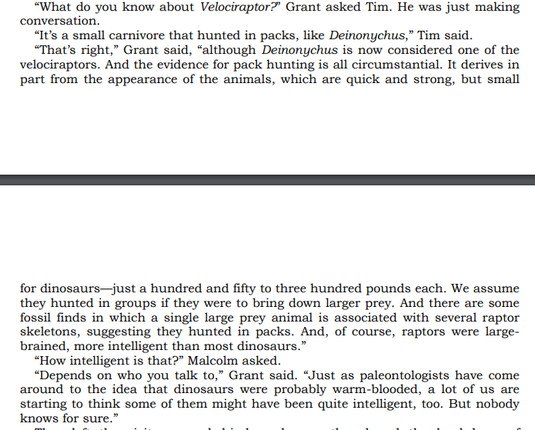 @drchaos In Jurassic Park, they are Deinonychus. But a large number of people think they're based on Utahraptor because of the size. The thing is that thats not possible since it was published after the book was written. Which is why the hint says that people think it is but its impossible.