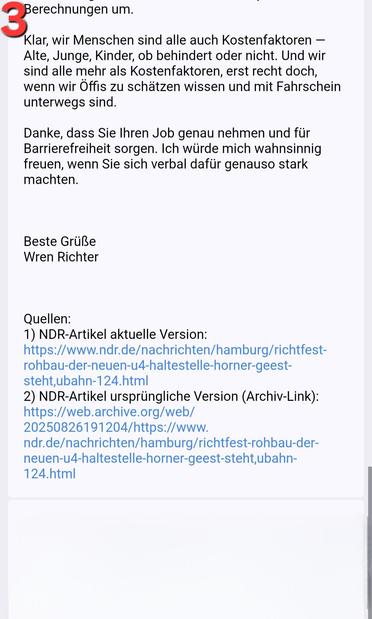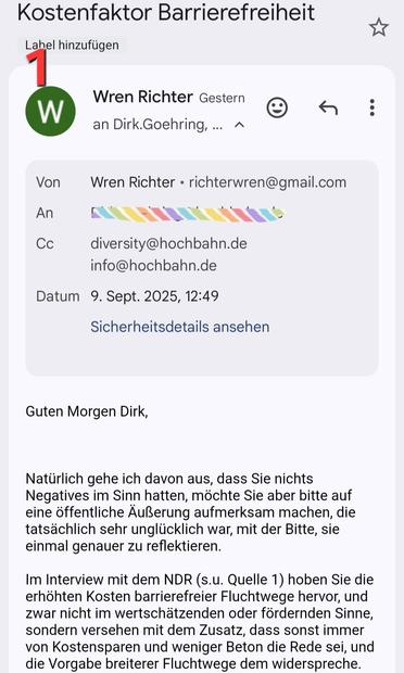 Gestern habe ich @hochbahn eine freundliche Mail geschrieben und an das im Grundgesetz verankerte Menschenrecht auf #Inklusion erinnert. Ich bat darum, sich Gedanken zum Subtext der Äußerung zu machen, auch hinsichtlich des gesellschaftlichen Klimas. Die EMail des Projektleiters (im Screenshot unsichtbar gemacht) habe ich nicht explizit im Netz gefunden und aus dem üblichen Email-Muster offen im Netz befindlicher Hochbahn-Kontakte konstruiert. Noch ist keine Antwort erfolgt.