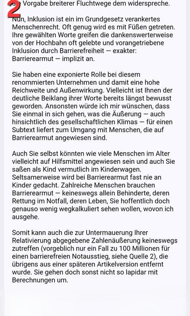 Hierzu wurde sogar noch eine absurde, relativierende Fantasiezahl geäußert: Der Bedarf barrierearmer Fluchtwege betrage "ein Fall zu 100 Millionen". Dieses wurde nachträglich von der NDR-Redaktion entfernt. Die andere Aussage blieb journalistisch unhinterfragt stehen.