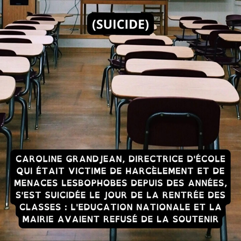 #SUICIDE de #CarolineGrandjean directrice d’ #école de #moussages #victime de #harcèlement et #menaces lesbophobes depuis des années, le jour de la #rentrée des classes.