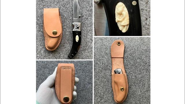 ナイフケースです。木型絞りで立体成形。ココペリが美しいナイフです。