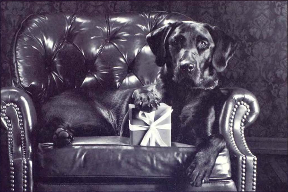 The image portrays a black and white photograph of a large, well-groomed dog seated in an ornate leather armchair.