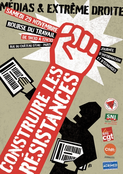 Samedi 29 novembre à la Bourse du travail de Paris, le collectif VISA (Vigilance et initiatives syndicales antifascistes), l’association ACRIMED (Action Critique Médias), le SNJ (Syndicat national des journalistes), le SNJ-CGT et la CFDT Journalistes organisent une journée d'informations et d'échanges sur le thème "Médias et extrême droite : construire les résistances".