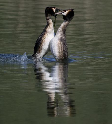In perfekter Synchronität erheben sie sich und präsentieren stolz Wasserpflanzen – ein faszinierendes Ritual der Zuneigung und Partnersuche. 🐦💚