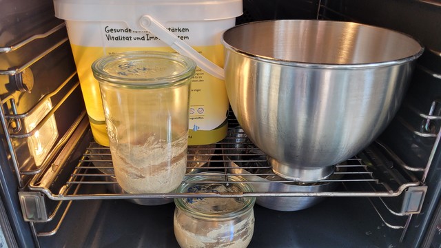 Nachdem die Mehlmangelwirtschaft hier erstmal wieder beendet ist, kann wieder geteigt werden. Alle Sauerteige sind angefrischt, ein Hefevorteig geht vor sich hin und, ähm, der Eimer (in dem ich einen Teil der Vorräte lagern werde) nutzt die Wärme mit zum Trocknen.