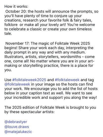There’s always a lot of magic submissions and it’s open to all. Post your work during November 17 to 23 and tag it with #folktaleWeek #FolktaleWeek25 so we can see and share what everyone has created. This mainly occurs on Instagram but many, like me, will also be posting here. You should join!
