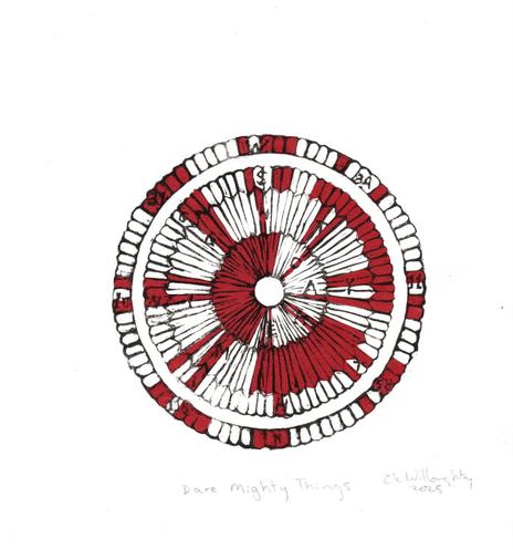 This is a collaged lino block print with an image of the parachute deployed during the descent of the Mars Perseverance rover as it landed on the planet February 18, 2021. The spacecraft team selected the red and white stripes to encode a secret message in binary: "DARE MIGHTY THINGS" along with