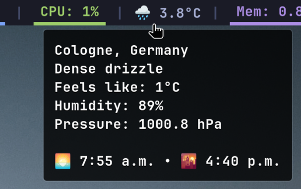 waybar-weather v0.2.0 is out and removes the depencency on Geoclue by implenting its own geolocation sub/pub bus. It also is now fully customizable via templates, allowing the user to make it look like they want.