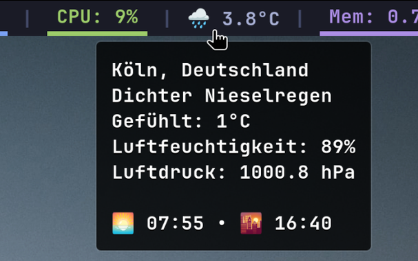 waybar-weather v0.2.4 is out. Some exciting new features were added: GPSd for geolocation lookup, an alternate text template to show current or forecasted weather by clicking the widget and i18n support for all displayable elements.
