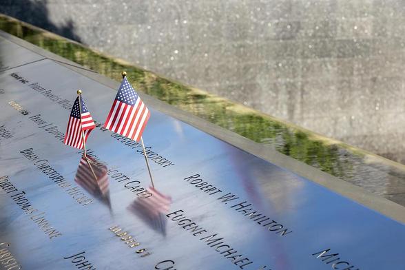 Two American flags adorn a plaque full of names of some of those who died in the 9/11 attacks in New York City, USA.In a solemn and poignant display, two tiny resolute American flags stand as sentinels of remembrance over a plaque that bears the weight of a profound history etched in sorrow.
