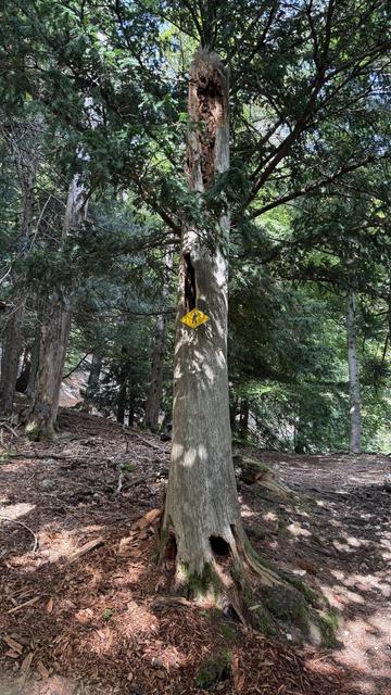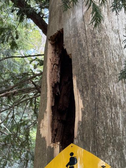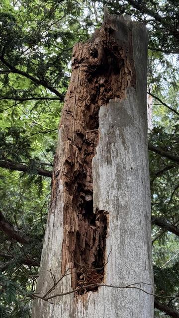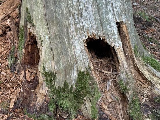 An old tree, the lower part still standing. But it has also been carved out from the inside, probably by ants or other small forest life forms.