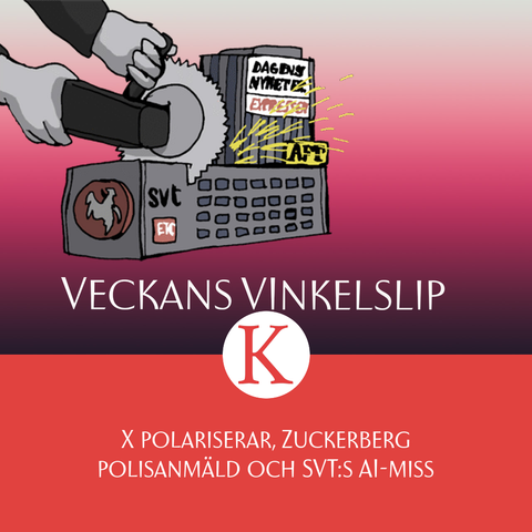 INGEN BETALVÄGG! X:s algoritmer ökar polariseringen, Metas vd Mark Zuckerberg polisanmäls för bluffannonser och SVT:s AI-miss ger SD vatten på sin censurkvarn. Det är några av ämnena som avhandlas i Veckans vinkelslip.
