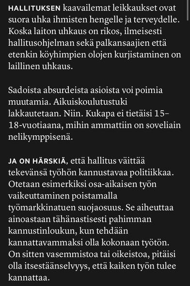 “If it is indeed the case that after the cuts planned by the government, the salary will be deducted directly from the labour market support, it would mean about 450 euros less income per month, Santtu says, based on his calculations.” #politics #politicsFI #rightWingPolitics #finland #systemicViolence #welfareCuts