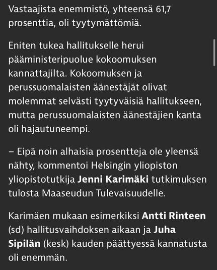 ”Only about a quarter of Finns are satisfied with Petteri Orpo's (Coalition Party) government, according to a survey commissioned by Maaseudun Tulevaisuu in early August. Of the respondents, 6.8 percent said they were very satisfied with the government's activities, while 18.6 percent were quite satisfied.”