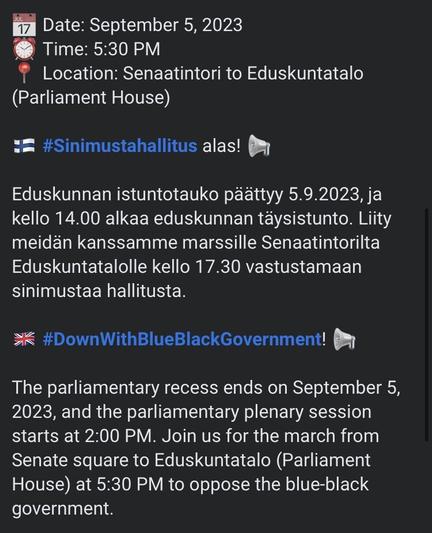 Next protests is 5.9. in Helsinki as the parliament gathers for the first time.