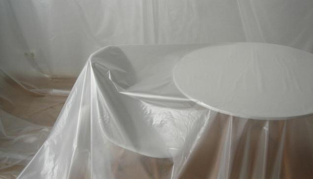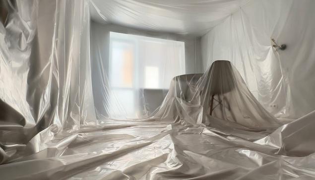 Художница полностью покрыла все предметы в комнате прозрачно-белёсым полиэтиленовым (#LDPE) полотном и рассуждает про «трансцендентный разграничитель»...