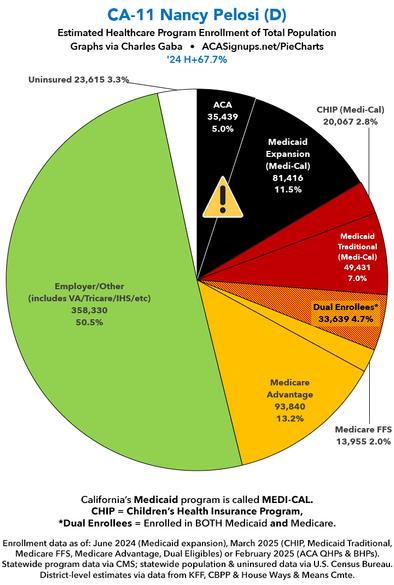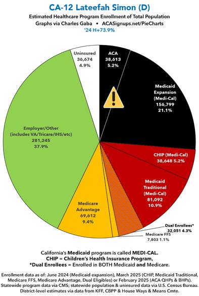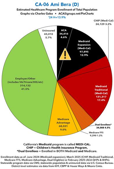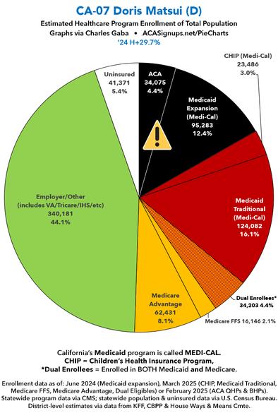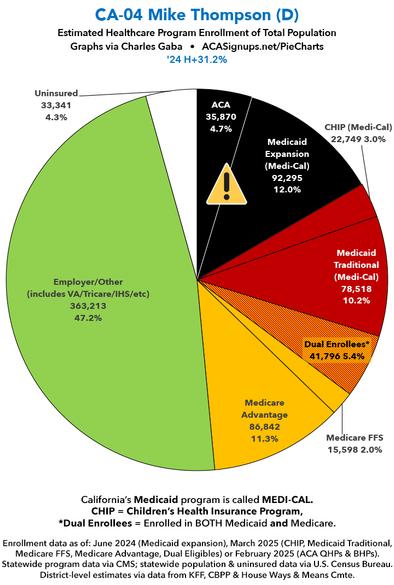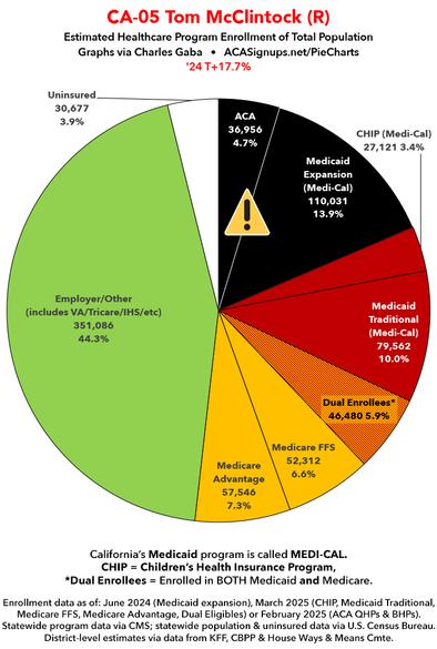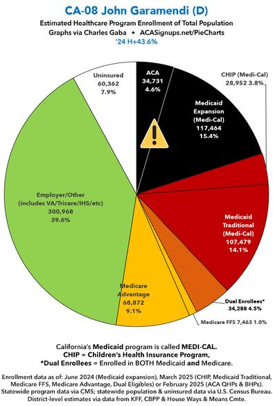 Over the past couple of months I've compiled a master spreadsheet breaking out enrollment in ACA plans (Qualified Health Plans & Basic Health Plans), Medicaid/CHIP coverage (both traditional & via ACA expansion) and Medicare (both Fee-for-Services & Advantage) at the Congressional District levels. With the pending dire threat to several of these programs (primarily Medicaid & the ACA) from the House Republican Budget Proposal which recently passed, I'm going a step further and am generating pie charts which visualize just how much of every Congressional District's total population is at risk of losing healthcare coverage. USE THE DROP-DOWN MENU ABOVE TO FIND YOUR STATE & DISTRICT. You can find the data sources & methodology explanation links here. (Note: I've broken California's 52 House districts into 3 pages. This one includes districts 1 - 18; use the dropdown menu to select districts 19 - 36 or 37 - 52). UPDATE 4/21/25: Scroll down for high-def printable PDF versions of each district! UPDATE 7/1/25: I've updated the web versions of the graphics with the most up-to-date enrollment data I have access to. The black sections w/the ⚠️ symbol are those most at risk of losing healthcare coverage due to H.R. 1, the "One Big Beautiful Bill Act" (aka the #MAGAMurderBill).